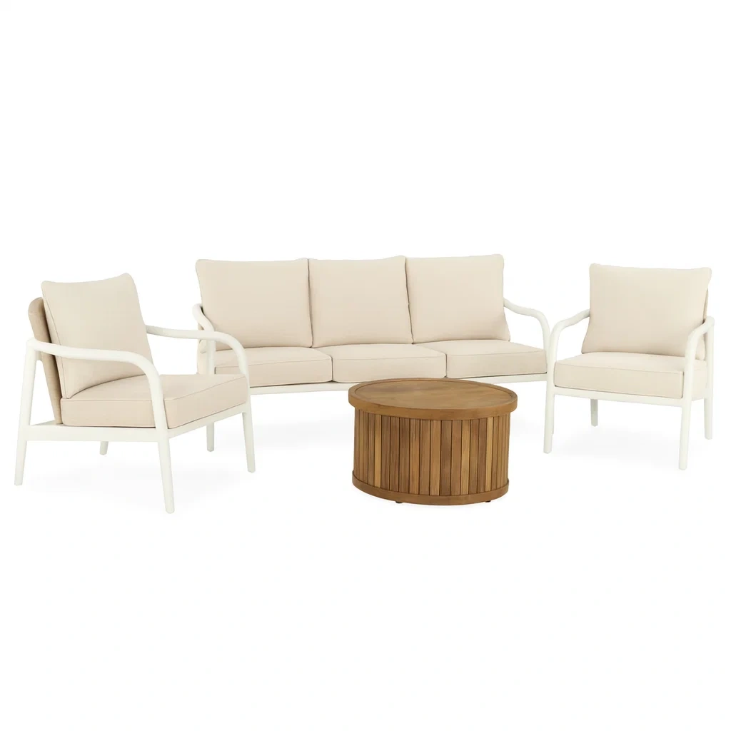 Struttura dei divani in alluminio e cuscini in poliestere. Tavolino realizzato in legno massello con finitura naturale.